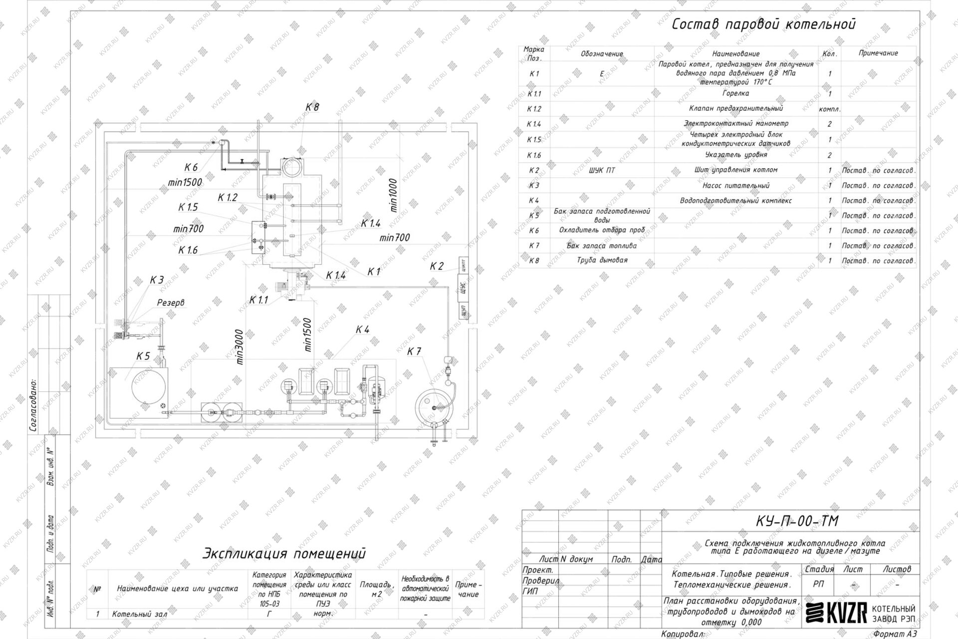 Чтобы правильно подключить дизельный паровой котел 1600 кг / 1.6 т пара -170°С -0,9 МПа / 9 кгс/cм² в котельной необходимо оставить проемы для обслуживания оборудования во время эксплуатации. На представленной здесь схеме обозначены их размеры. Кроме того, в данной примерной схеме монтажа паровых котлов и оборудования указан перечень минимально необходимого вспомогательного оборудования.