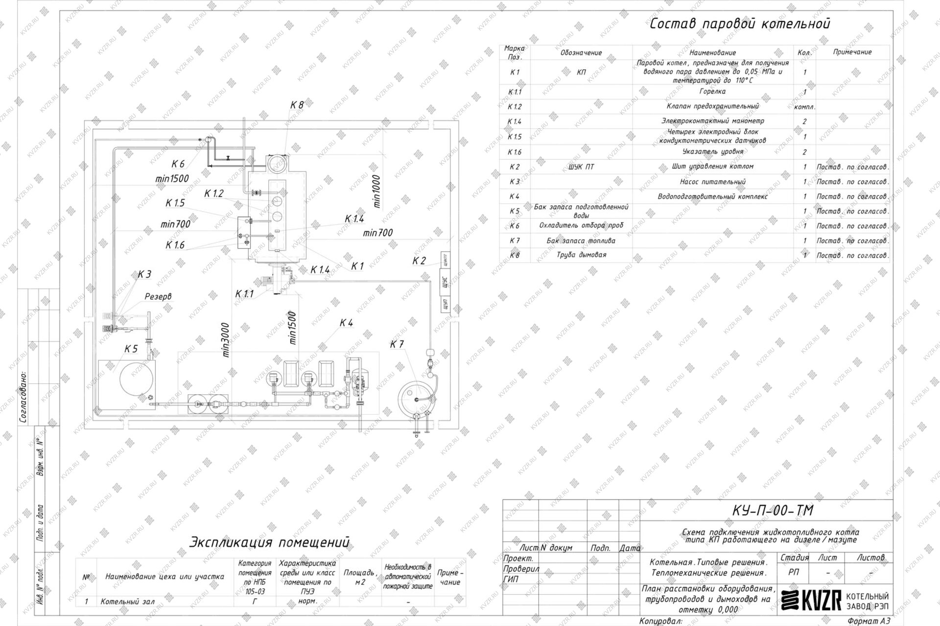 Чтобы правильно подключить дизельный паровой котел 300 кг / 0.3 т пара -115 °С -0,07 МПа / 0,7 кгс/cм² в котельной необходимо оставить проемы для обслуживания оборудования во время эксплуатации. На представленной здесь схеме обозначены их размеры. Кроме того, в данной примерной схеме монтажа паровых котлов и оборудования указан перечень минимально необходимого вспомогательного оборудования.