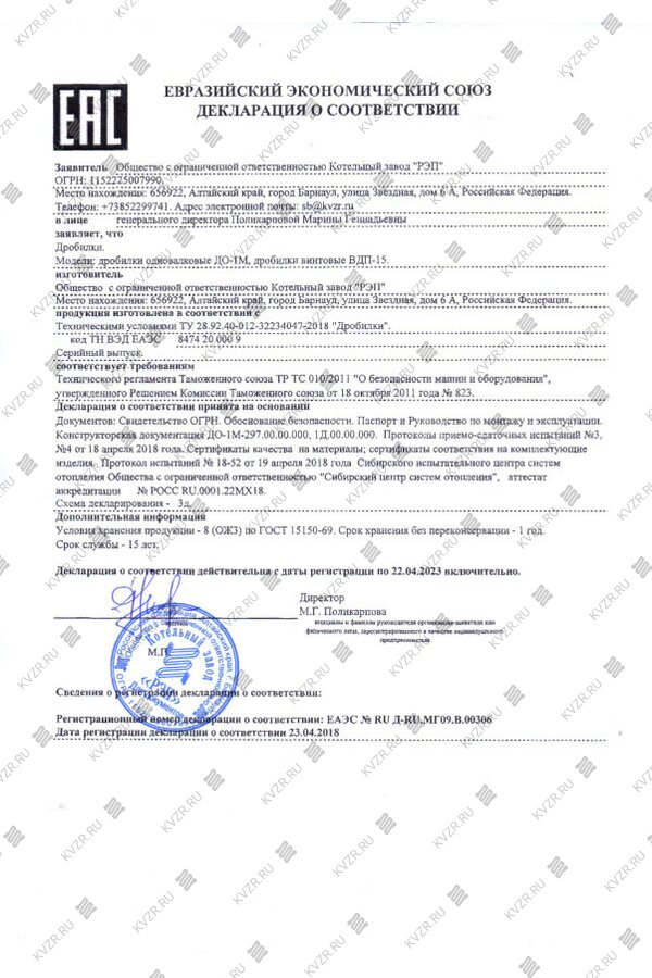 Получен сертификат соответствия на дробилки одновалковые ДО-1М, дробилки винтовые ВДП-15