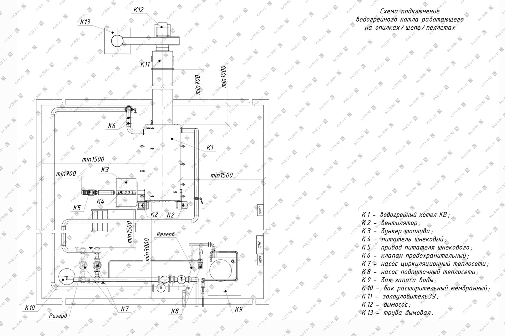 Чтобы правильно подключить пеллетный котел 0.35 МВт в котельной необходимо оставить проемы для обслуживания оборудования во время эксплуатации. На представленной здесь схеме указаны их минимальные размеры. Кроме того, в данной примерной схеме монтажа водогрейных котлов и оборудования указан перечень минимально необходимого вспомогательного оборудования для правильной работы котла.