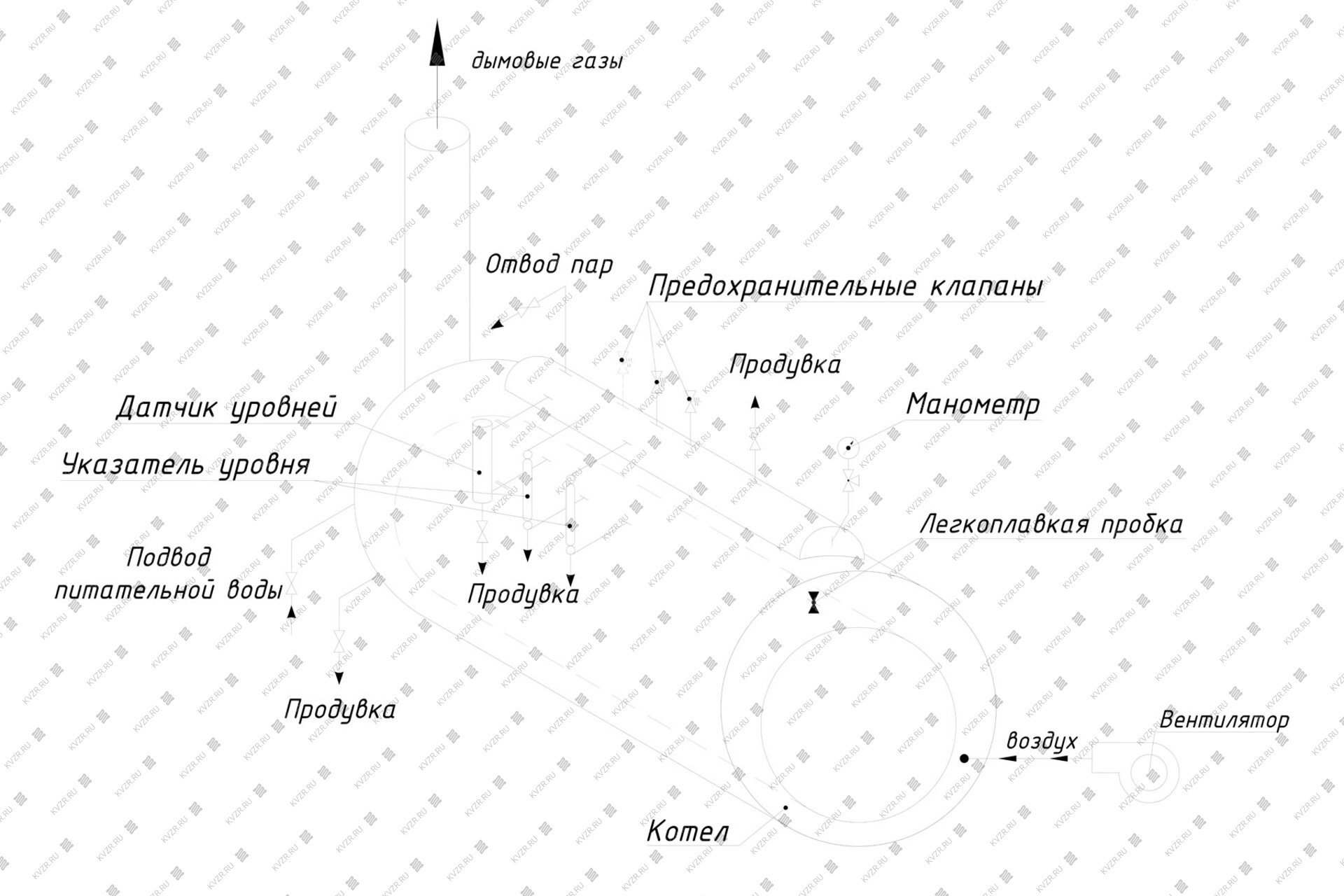 На котле имеются продувочные штуцера Ду25, Ду15 и Ду10. Штуцер Ду25 предназначен для удаления шлама, образующегося в результате работы котла, периодической продувки котловой воды и для спуска воды в случае необходимости. Штуцер Ду15 предназначен для продувки водомерной колонки. Штуцера Ду10 предназначены для продувки указателей уровня.